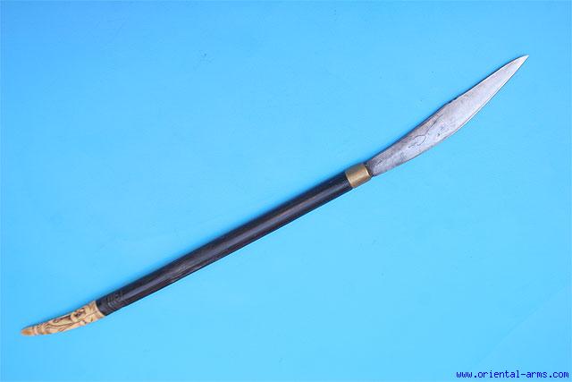 This knife with a short blade and long handle is the side knife of the Mandau sword, also known as Piso Raout. It is a rare piece and usually missing from the many Mandau swords on the market. Very well made, thick 6 inches blade. Hardwood handle with a finely carved bone end. Total length 18 inches. Very good plus condition. |