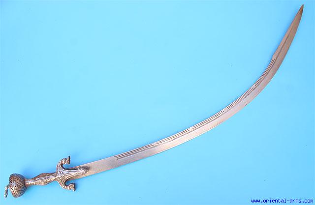 The Pulwar is the Afghan relative of the Indian Tulwar. The Pulwar hilt has a very distinct shape, with down curving quillons. The one offered here for sale is a very good fighting sword, with well forged and nicely fullered steel blade, 31 inches long, with an 8 inches raised back edge. The steel handle is of classical shape with a finely pierced pommel. Total length 36 inches. Very good condition. Minor edge nicks. Very good fighting sword. Very well balanced. |