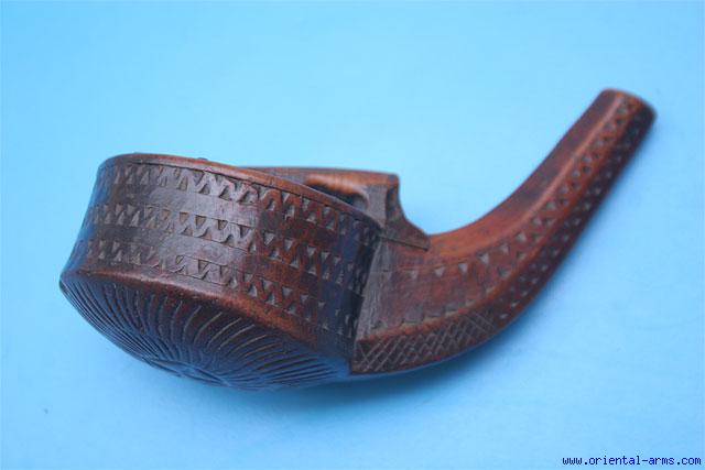 This wooden powder flask is Moroccan, late 19 – early 20 C. Carved in a single wood block with a wooden cover. 3 ½ inches diameter, 2 inches tall with a 4 ½ inches spout. Total length 7 ½ inches. Very good condition with good age patina. It should be noted here that some sources define this shape of flask as Ottoman, but we think that the pattern carving on the wood is very typical North African. |