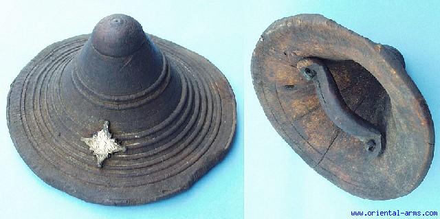 We offer here for sale this Buckler (hand shield) from the horn of Africa. It is 9 1/2 inches in diameter, 6 1/2 inches in height and it is made from the hide of the Hippopotamus. It is more than 5/8 inches thick and so though that it will stop a bullet from a small caliber pistol. These type of shields were sought after in all the area and were traded all the way through Zanzibar to Oman. Good condition, some damage to the buckler edge. |