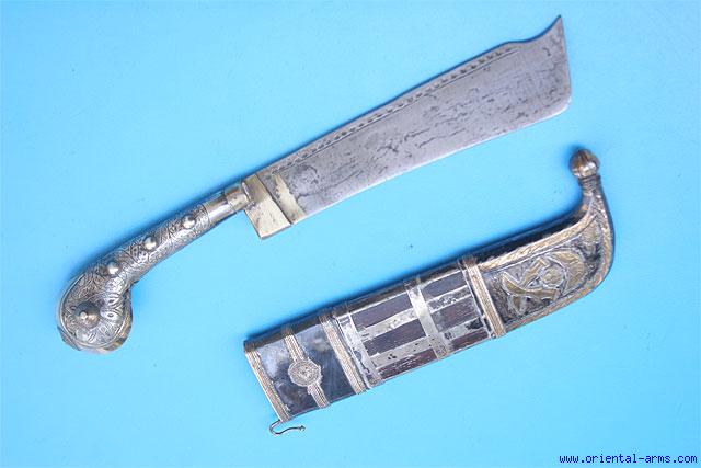 The Pichangeti is one of the rarest knives of the Indian arsenal. It is associated with the Coorg people inhabiting the South Western shores of India. It has a short heavy single edge blade, 6 inches long, brass bolsters and finely engraved silver handle and gold pommel cap. The wood scabbard is also covered with silver mounts, partially gilded bands and the up-curving scabbard tip is of a very clear Arabic influence. Total length 11 1/2 inches. Very good condition. Old brass brazing on the blade base. |
