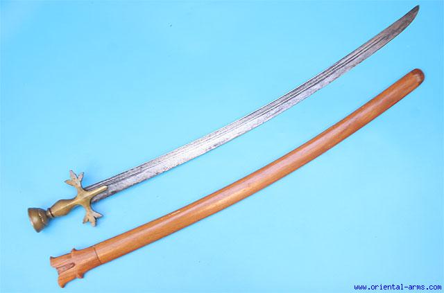 The Podang, sometimes also known as Piso Podang is a sword common to Sumatra and specifically to the Batak People. The influence of the Indian Tulwar sword on its specific hilt shape is evident. This very good example has a single edged fullered and curved blade, 32 inches long with a 9 inches back edge. The Solid brass hilt is of a typical form with a reverse cup shape pommel. Wood scabbard. Total length 37 inches. Very good condition. Blackened spots on the blade. Small cracks on the scabbard |
