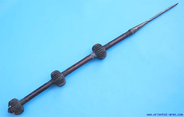 We offer for sale this unusual and attractive Javelin/spear. We think it is North African, early 20 C. heavy rectangular blade 7 ½ inches long socketed on a hardwood haft 30 inches long with three big 3 inches diameter ribbed balls carve on the haft. Total length 38 inches. Very good condition. Some losses to the ribs on the balls. |