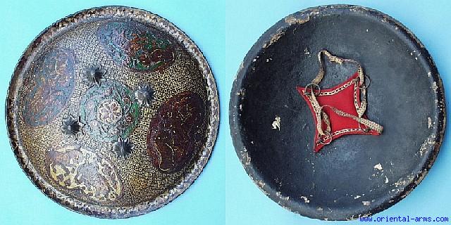 This is a hide shield from India. It is made from Buffalo (?) hide, 16 inches in diameter and 3 inches in height with four brass bosses. It is entirely hand painted in gold, brown green and yellow colors in a very delicate design, with four medallions with hunting scenes. The inner side is painted black. Very good condition, with few age cracks to the paint and minor hide age distortions. The original inner cushion and handles are missing. |