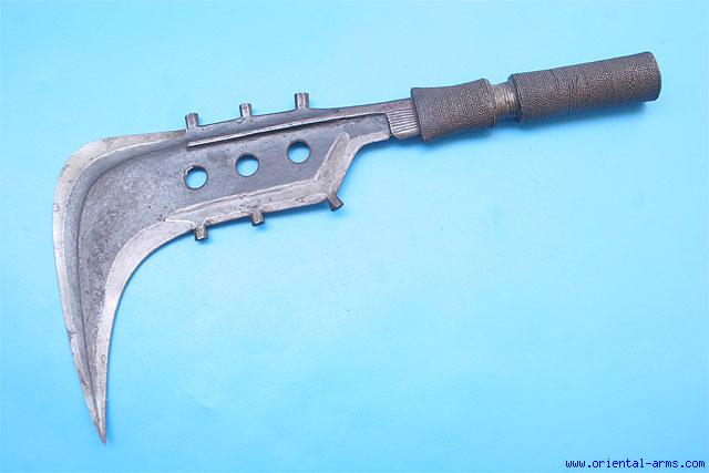 The knife of the Mangbetu people residing in Central Africa was originally used as a weapon of war and also as an agricultural implement, but later on developed into luxury item and a symbol of status. This one is a fine early 20C.,with a larger than usual sickle shaped. 12 inches (point to point) blade, very well forged. The original blackening of the steel with the polished edges is maintained. Wood grip bound with twisted brass wires. Total length 17 inches. Very good condition. A fine authentic piece. |