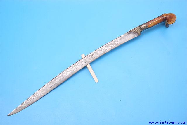 This Yataghan sword is Ottoman, Balkan origin, early – mid 19 C. Fine laminated blade richly decorated with silver inlay (true inlay) of inscriptions in Arabic letters. Blade length 22 inches. Elephant ivory grips of good age color (with later repair of cracks). Chased gilded silver grip strap and bolsters. Total length 27 inches. Very good condition. Minor losses to the silver inlay. |