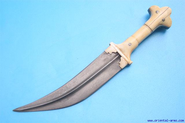This dagger is coming from North India, early – mid 19 C with a may be earlier blade. Curved blade 7 inches long, forged from fine high contrast wootz (Damascus, watered) steel, with a pronounced central rib. Four sectors elephant ivory grips with a lobbed pommel, reminding the Tiger Teeth style daggers. Total length 11 inches. Very good condition. No scabbard. |