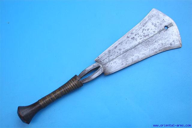 This dagger / short sword is used by the Yakoma people from Zaire, but also find use with their neighboring tribes of the Sangi and Ngbandi. Heavy, very well forged 8 ½ inches blade with thick “ear” at the base. Wood handle bound with brass strip. Total length 13 ½ inches. Very good plus condition. Mid 20 C. |
