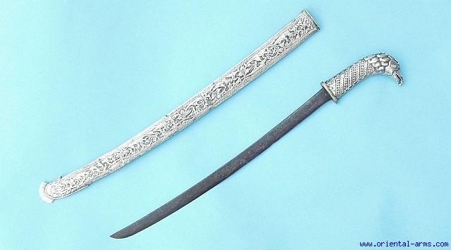 We offer for sale a very fine sword from Indonesia, probably Sumatra. Slightly curved blade of pamor steel, 15 ½ inches long. Silver hilt with a bird shape pommel very finely engraved and a silver scabbard with a beautiful silver chasing. Total length 24 inches. A work of quality and a piece of art. For the advanced collectors.