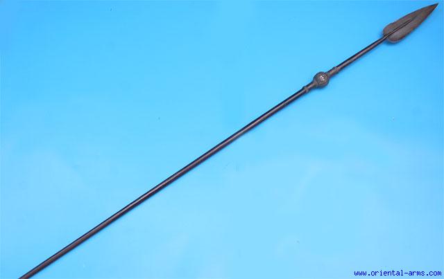 This spear is Indian, mid – late 19 C. Very well made blade with a central rib 7 ½ inches long, forged in one piece with a 7 inches faceted socket ending with a globular silver decoration. Wood haft with a steel tail. Total length 62 inches. Very good condition. One edge is very lightly reshaped. Dents on the silver decoration.