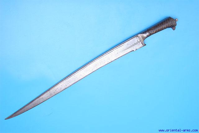 Up for sale this Khayber sword with massive blade 23 inches long 2 inches wide. Nicely ribbed dark horn grips. Steel bolsters. Total length 28 inches. Very good condition. No scabbard. Probably North India, mid - late 19 C. Very impressive sword.