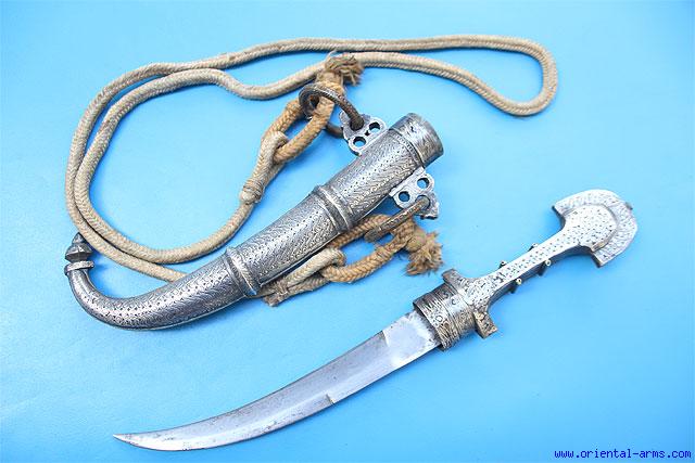 The Moroccan version of the Arab Jambiya dagger is locally called Koumaya and characterized by a slender blade, usually dual edged at its lower half and single edge at the top. There is a big variety in the decoration styles and quality of the handles and scabbards. This one is a fine example, circa 1900probably South Morocco. Good quality, 9 inches blade, brass handle and scabbard with finely chiseled and engraved silver front and enameled and nielloed collar and scabbard mouth. Big decorative carrying rings. Total length 16 inches. This Koumaya comes with its baldric carrying cotton rope. Very good condition. |