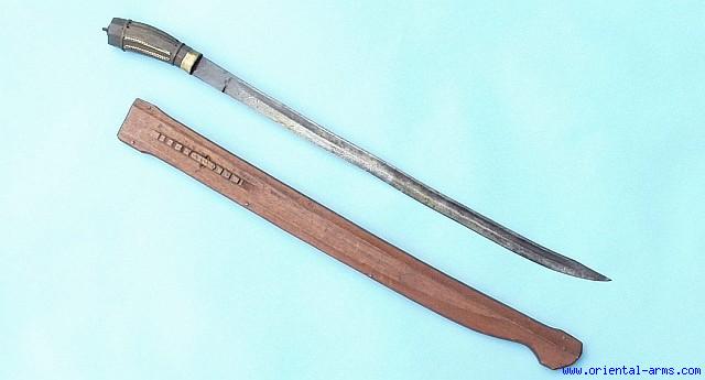 A very interesting, mid 20th C. sword from the Philippines, comprising a good fullered blade, 21 inches long, horn grip and carved wood scabbard. Very good condition. Very low price.