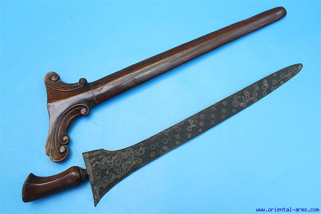 This Keris dagger is most probably Java, mid – late 20C. Massive 16 inches traight blade of good pamor steel. Finely carved wood handle with brass mendak. Finely carved wood scabbard. Total length 22 inches. Very good condition.