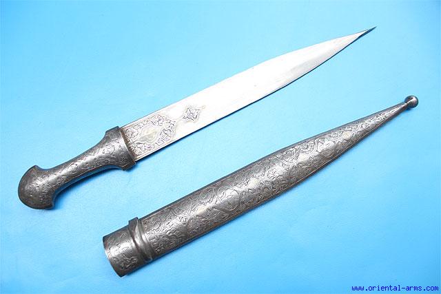 This dagger is Persian, late Qajar period, late 19C. The genral shape is of a Turkish Qama. Straight double edge blade 12 ½ inches long, chiseled on the base. Whole steel handle and scabbard, both chiseled in a classical Qajar style. Total length 19 inches. Very good condition. |