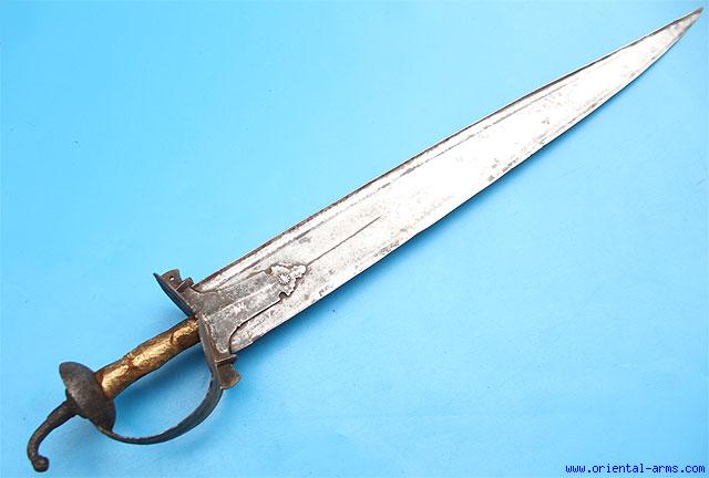 This sword is Indian, most probably North India, late 18 -early 19 C. The massive blade is in a classical shape of a Khyber sword 24 inches long and 3 inches wide. It is finely fullered and with a pronounced T spine. The handle is a Khnda style half basket handle with a short pommel spike. The grip is covered with fabric with golden threads (Probably later). Traces of silver plating on the handle. Total length 30 inches. Very good condition to age. No scabbard. |