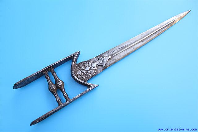 This early Kattar push dagger is coming from India, probably Deccan or South India, 17C or earlier. Massive slightly curved blade with central rib 12 inches long with slightly thickened tip. The blade is riveted to a steel handle with finely chiseled handle with pierced flared side bars. Total length 16 ½ inches. Very good condition to age. Rare and very good item. |