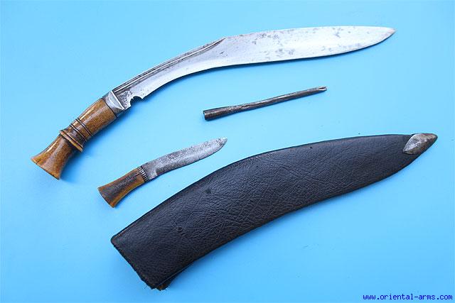 This Khukuri knife has a very good finely fullered, blade. Bone handle with steel bolsters. Leather scabbard with steel tip and original accompanying knife also with bone handle. Blade 11 inches, total 15 inches. Very Good condition. Very nice age patina on the bone handles. Nepal, late 19 – early 20 C. |