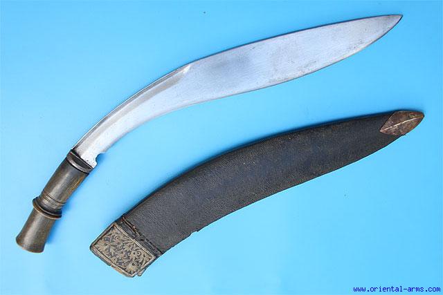This Rare and large size style of Khukuri is also known as Hanshee. The name comes to describe the continuing arch shape of the blade and the handle. Blade 16 inches, well forged with ridged spine and steel bolsters. Horn handle with clear fibrous structure, possibly rhino horn. Leather covered scabbard with back compartment. Total length 21 inches. Very good condition. Rare type, Nepalese, late 19 C. |
