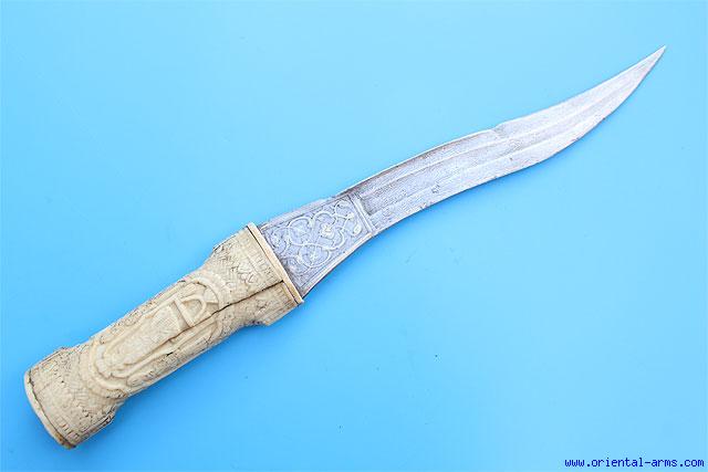 This Khanjar dagger is Persian, mid 19C. mid Qajar period. Unusual shape of re-curving blade finely fullered and with a wide spine. The blade is very finely etched to imitate wootz steel, and decorated with gold koftgari work. Bone handle very elaborately carved in a classical Qajar style. Blade 10 ½ inches total 15 ½ inches. Very good condition. Age cracks on the grip but it holds solid. |