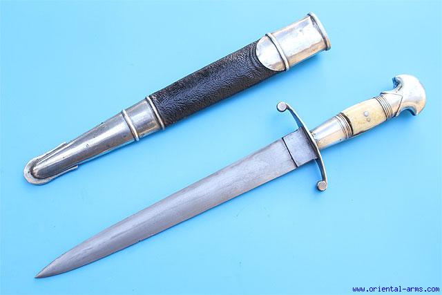This dagger is of Afghan origin, late 19 C. in the style and shpe of a European dagger. Probably a custom made to European (British?) officer serving in the area or a trade for the European market. Wootz blade 10 inches long. Walrus grip with silver mounts in a clear Afghan style. Silver cross guard. Leather covered scabbard with silver mounts. Total length 16 inches. Very good condition. Minor forging flaws and edge nicks. |