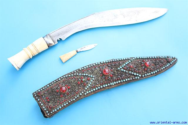 This Khukuri knife is late 19 - early 20 C. Good swollen blade with steel bolsters and bone handle. Classical leather covered scabbard with compartment for accessories and a small bone handled knife. Sometime in the mid 20C. The scabbard was added a brass cover very richly decorated and set with many turquoise, red and blue stones. Blade 12 inches. Total 17 inches. Very good condition. Handle cracked but holds very solid. |