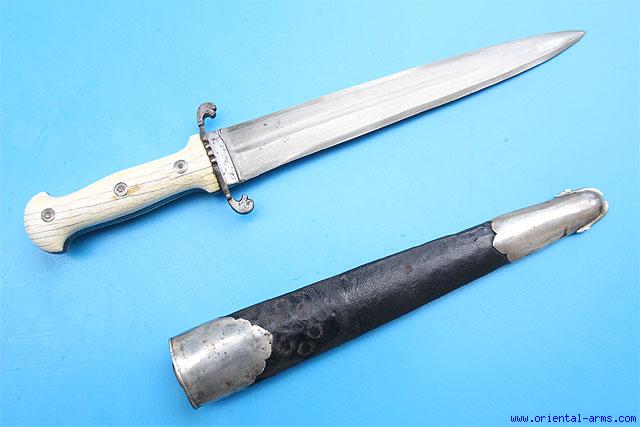 This dagger is of Afghan origin, late 19 C. in the style and shape of a European dagger. Probably a custom made to European (British?) officer serving in the area or a trade for the European market. Wootz blade 10 inches long. Ivory grip with steel cross guard. Leather covered scabbard with silver mounts. Total length 15 inches. Very good condition. |