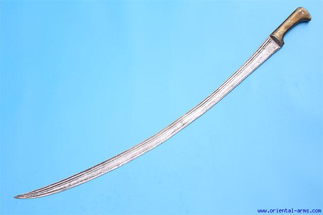 This rare shashqa style saber is coming from Central Asia or Afghanistan. Blade 31 inches, deadly sharp and finely fullered. Horn grips with steel grip strap and bolsters. Total length 36 inches. Very good condition. The grips rivets are possibly a later repair. The attribution to Central Asia and /or Afghanistan is derived from the shape of the handle, very similar to Karud / Pesh Kabz daggers from the same area. A rare saber. |