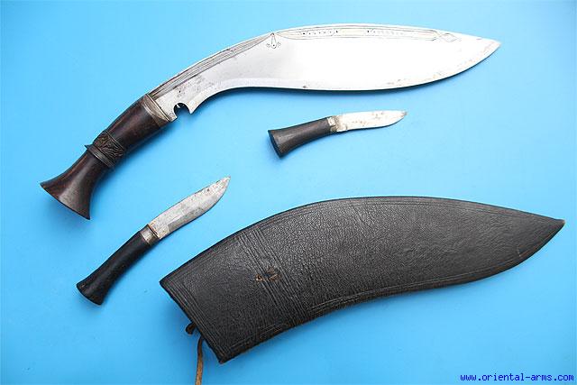 This Khukuri knife is Nepalese, dated 1914. It has a heavy wide, swollen blade finely forged with ridged spine and deep fullers. Steel bolsters. The blade is marked L.D 9-9-14. Black wood handle with a carved central ring and steel pommel plate. Original leather covered scabbard with a back compartment and accompanying knives. Blade 12 inches, total 16 inches. Very Good condition. Very impressive Khukuri. |