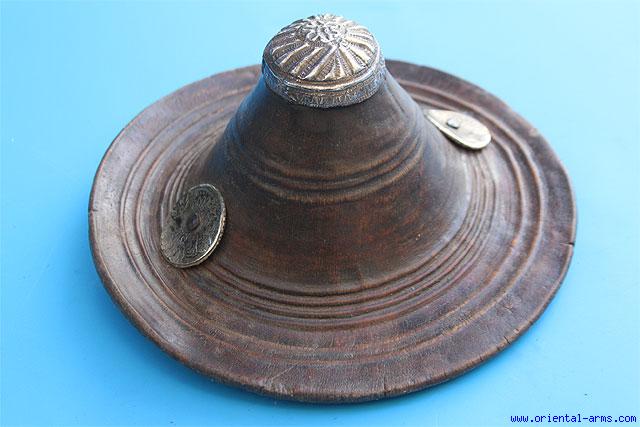 This is a Buckler (hand shield) from the horn of Africa. It is 9 ½ inches in diameter, 4 ½ inches in height, made from a thick hide of the Hippopotamus . In this thickness it is believed it will stop a bullet from a small caliber pistol. This buckler is fitted with two heavy silver coins and a chased silver cap (very rare). Very good condition. The silver coins are somewhat worn from use. We believe the coins to be Maria Theresa Thalers, mid 19C. mint, a common trading coin and decorative addition to artifact in this part of the world. These type of shields were sought after in all the area and were traded all the way from Africa through Zanzibar to Oman, therefore they are sometimes defined as Omani Bucklers. |