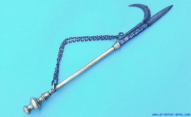 This is an Indian ANKUS, (Elephant Goad), used by the Indian to guide their elephants. Although it is not a pure weapon, it is always shown in Museum and private collection in connection to Indian arms and armor. It also finds extended use as a ceremonial item displayed in parades and other important events. This one has a 6 ½ inches steel blade, pierced along all edges (very unusual) and brass haft with a brass chain. Total length 17 inches. Very good condition. The blade is slightly loosed. This item is an original unusual piece, dated probably to the first half of the 19th C. and a very interesting addition to any Indian art / or edged weapon collection. |