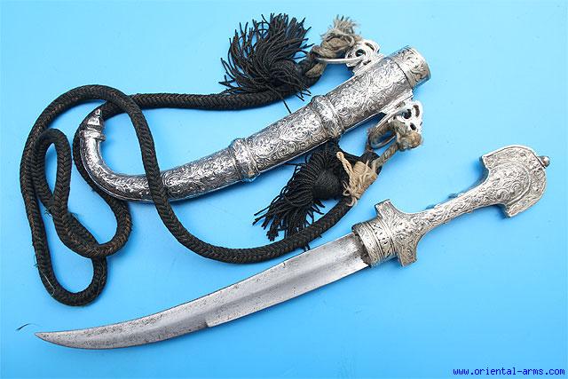 The Moroccan version of the Arab Jambiya dagger is locally called Koumaya and characterized by a slender blade, usually dual edged at its lower half and single edge at the top. There is a big variety in the decoration styles and quality of the handles and scabbards. This one is a fine example, circa 1900. Good quality 10 inches blade of hollow ground cross section. Finely chiseled and engraved silver handle and scabbard. Total length 16 inches. This Koumaya comes with its baldric carrying cotton rope. Very good condition. |