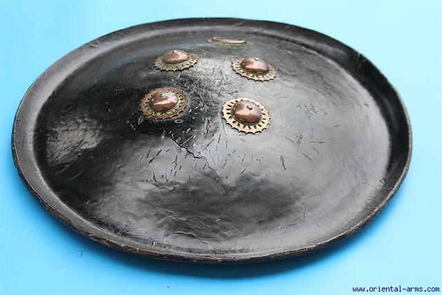 This War shield is Indian, mid 19C., made of heavy buffalo hide and black lacquered on both sides. Gilded brass bosses and a lunette shape decoration. Inner cushion cover. Diamaeter 20 Inches. Very good condition. Age cracks on the lacquer cover. Losses to the gilding. Handles missing. |