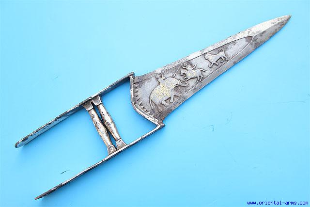 This fine Kattar dagger is Indian, late 18 to early 19 C. Wootz (Damascus) steel blade 9 ½ inches long, with armor piercing thickened tip, finely chiseled with hunting scenes: elephants and lions. And decorate with gold inlay (true inlay). Handle side bars as well as the cross bars are covered with silver. Total length 17 inches. Good condition. Unfortunately some pitted areas on the blade and losses to the silver cover of the handle. |