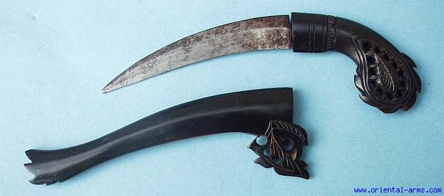 A small Korambi from the early 20 C. 3 ½ inches blade of flat diamond cross section. Carved and pierced horn grip and horn scabbard. 7 inches total length. Very good condition.