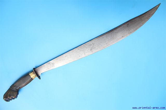 This large Filipino bolo sword is coming from Luzon, early 20 C. Heavy bellied blade 19 � inches long with a 5 inches clipped false edge. Finely carved horn grip with a fist shaped pommel. Brass collar and brass cross guard. Total length 26 inches. Very good plus condition. No scabbard.