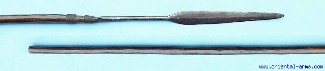 A throwing spear of the Zulu, known for their accuracy for hunting and as weapon of war. 45 inches long, 14 ½ inches blade held in place by braided steel wire. Very good condition, part of the steel wrapping is missing. Very attractive price.