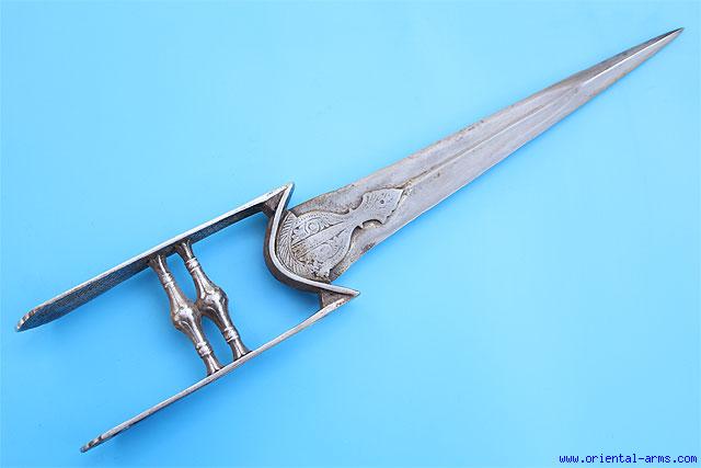 A very old probably 17 C -18C. version of the famous Kattar (Katar). It has a ribbed blade 12 inches long with thickened tip . Engraved steel blade holder and pierced handle throughout. 18 inches total length. Very good condition. A very low price considering its age. |