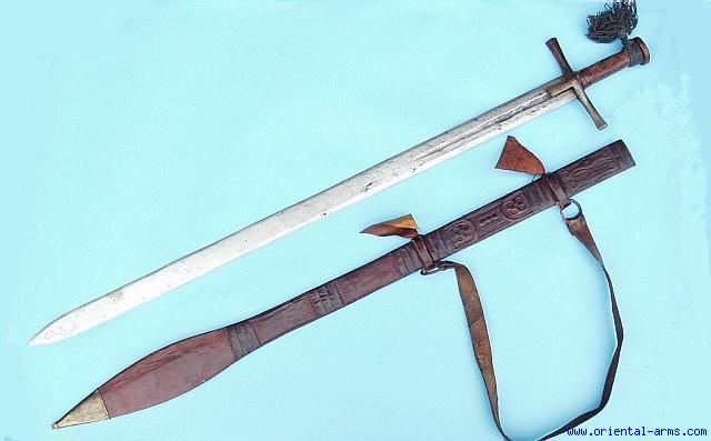 A very good, and complete Kaskara sword from the south Sudan Area. The blade is of better quality than the average seen on such swords and it is etched inside the central fuller in a floral design. It is more than 37 inches long. The handle is wood covered with a hide. The scabbard is made of tooled leather and it comes complete with the hanging belt. Very good condition. The blade has few darkened spots but no pitting. |