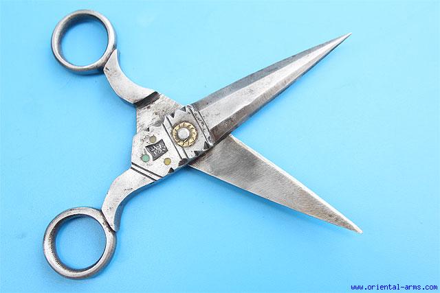 Up for sale are these heavy duty scissors, may be for fabric cutting. Fine Qajar steel work, colored stone inserts and maker stamp. 6 inches long.
