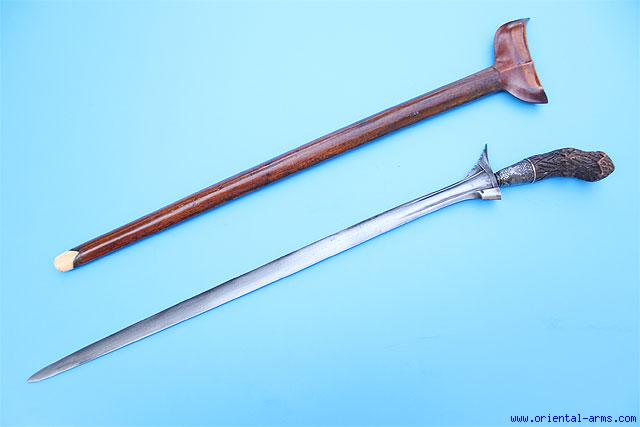 A Keris Penjang, also sometimes referred to as Execution Keris from Sumatra, late 19 - early 20 C. The massive blade is 19 ½ inches long. The hilt is very finely carved ivory with dark age patina. Fine grained wood scabbard with ivory tip. Total length 26 inches. Very good condition. Short age crack on the hilt. A fine piece. |