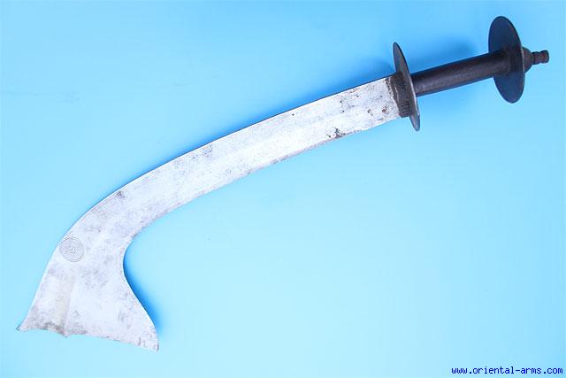 This Kora sword a sacrificial Kora and it is constructed to exactly meet this purpose: Heavy, down curving, blade, with its deadly sharp edge on the concave side and with wide heavy tip to provide the weight needed for beheading an animal with one sword stroke. This one has a huge 21 inches blade, 7 inches wide at the tip. The blade is marked with the classical “sun” and inscribed: shree dev samsher no 3, the name of the Rana ruler 1862-1914, who ruled Nepal for 4 month only in 1901. Cylindrical grips with disks shape cross guard and pommel. Total length 26 inches. Very good condition. |