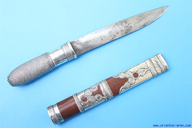 Very well forged blade 6 ½ inches long. The grip is finely bound with silver wires and the wood scabbard is mounted with filigree silver bands. Total length 12 inches. Very good condition. Fine knife.