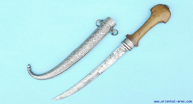 The Moroccan version of the Arab Jambiya dagger is locally called Koumaya and characterized by a slender blade, usually dual edged at its lower half and single edge at the top. There is a big variety in the decoration styles and quality of the handles and scabbards. This one is one of a top quality, with a relatively good 9 ½ inches blade and a big massive grip carved of Rhino horn. The scabbard and grip mounts are made of finely worked silver. Very good condition. A very good high quality piece. |