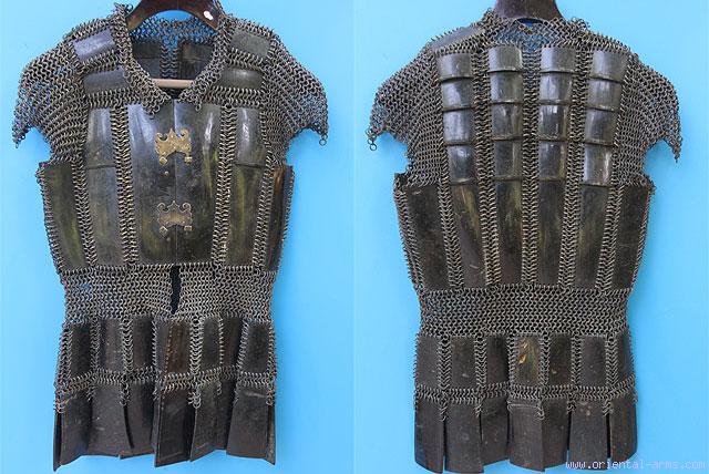 Up for sale this rare and complete Moro Armor from the Philippines, mid - late 19C. The armor is constructed from water buffalo black horn plates connected with brass rings, with two brass buckles on the chest plates. 26 inches high 18 inches wide, 6.9 Kg. total weight. Very good condition. Very minor losses to the plates. Very few rings are missing .An authentic original piece of great collectible value. |