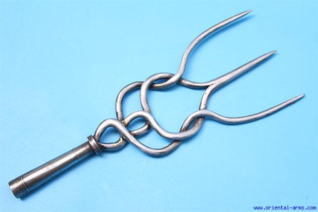 This unusual spear head is Indian, late 19 C. It is made of interlocking steel spikes with trident style tips. Steel socket decorated with silver koftgari work. Length 10 inches. Very good condition. This item is coming from the John Woodman Higgins Armory Collection . Acquired in 1927. |