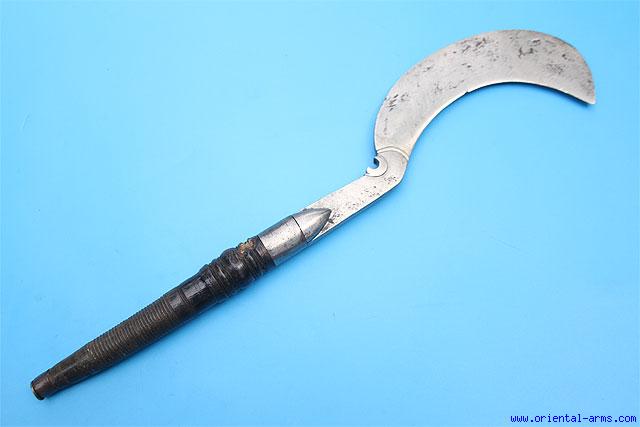 This curved knife is Nepalese, mid 19C. It is intended to sacrifice small animals or birds. The heavy sickle shaped blade is 11 inches long. The handle is turned horn. Total length 18 inches. Very good condition. This item is coming from the John Woodman Higgins Armory Collection . Acquired in 1970.