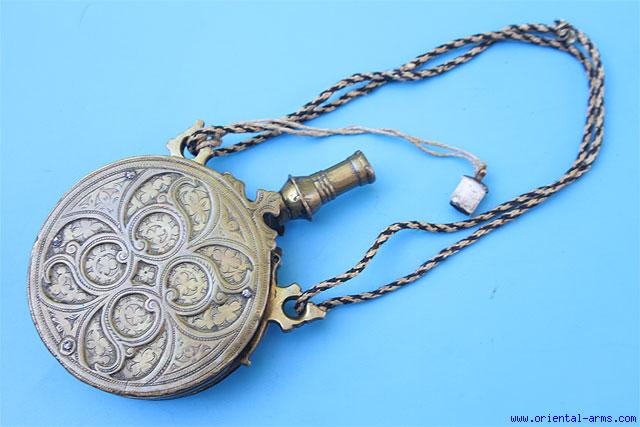 From Morocco comes this beautiful powder flask, bottle shaped, made from engraved heavy brass. 4 1/2 inches diameter, 1 1/2 inches thick and 7 ½ inches tall. Original plug and carrying cord. Very good condition.