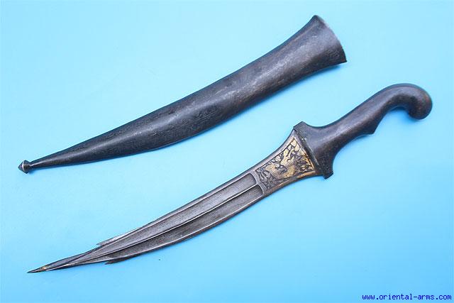 The Persian Khanjar with split blade is quite common, but most if not all found on the market are newly made, bazaar items, of rather mediocre quality and bad workmanship. Up for sale is the real one. Very fine steel blade with central rib and reinforced edges, split to five points at the tip and gold decorated at the base. Whole steel handle and scabbard with traces of silver decoration. Blade 11 ½ inches, total length 18 ½ inches. Very good condition. Minor losses to the gold decoration. Minor dents on the scabbard. A rare genuine find. |