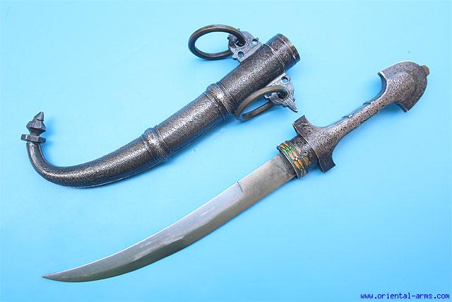 The Moroccan version of the Arab Jambiya dagger is locally called Koumaya and characterized by a slender blade, usually dual edged at its lower half and single edge at the top. There is a big variety in the decoration styles and quality of the handles and scabbards. This one is a fine example, circa 1900 probably South Morocco. Good quality, 9 inches blade, brass handle and scabbard with finely chiseled and engraved silver front with enameled and nielloed collar. Big decorative ears for carrying rings. Total length 15 ½ inches. Very good condition. |